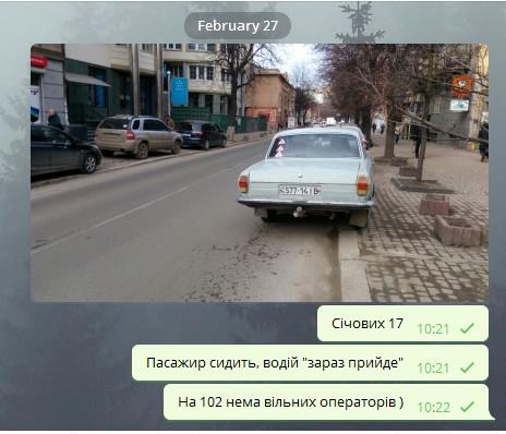 "Автобуси реально мусили чекати, коли в лівій смузі була черга, щоб об'їхати цю Волгу. Моє усне зауваження пасажирці, яка сиділа в машині, її особливо не вразило, сказала я не знаю, "скоро прийде". І тут вперше за цілий рік я не додзвонився на лінію 102 -- автовідповідач сказав, що "нема вільних операторів". І знайомі патрульні, яким скинув фотку, якраз були оффлайн. І ніякий екіпаж в цей час по Січових Стрільців не їхав. Ну я і пішов в свій офіс, вирішивши що я зробив як громадянин все, що міг. А тепер питання до вас: Хто віноват? Департамент 102? Як мені комунікувати з патрульними, коли я не можу дозвонитись на 102? Є якийсь "черговий" акаунт на Телеграмі? Не писати ж мені все підряд начальнику і заступникам", - розповів Загреба.