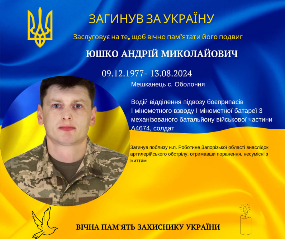 "Знову страшна звістка прийшла у нашу громаду. На війні з росією загинув наш Захисник, мужній воїн, який поклав своє життя за волю і незалежність України!ЮШКО АНДРІЙ, 1977 року народження, мешканець с. Оболоння, водій відділення підвозу боєприпасів І мінометного взводу І мінометної батареї 3 механізованого батальйону військової частини А4674, солдат. Загинув поблизу н.п. Роботине Запорізької області внаслідок артилерійського обстрілу, отримавши поранення, несумісні з життям", - повідомив очільник громади.
