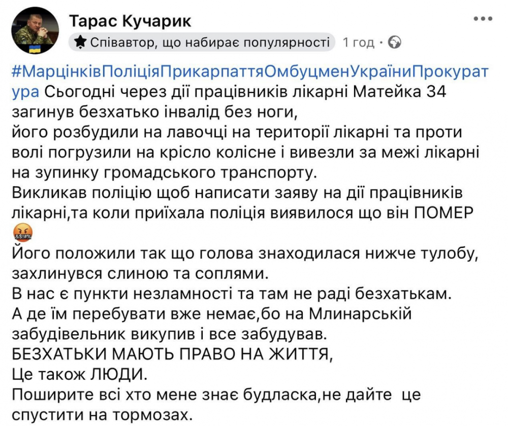 Очільник Івано-Франківська Руслан Марцінків відреагував інцидент, коли працівники лікарні на Матейки вивезли безпритульного поза межі медзакладу та залишили помирати на лавці зупинки громадського транспорту.