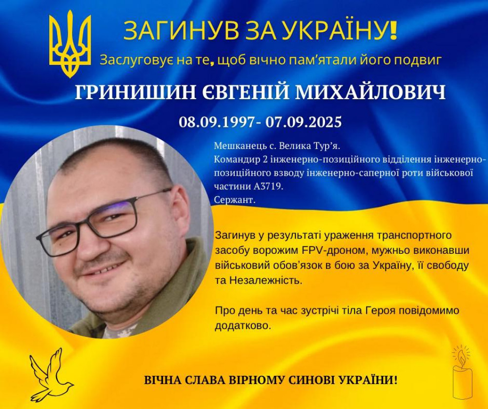 Звістку про загибель мешканця с. Велика Тур’я, сержанта, командира 2 інженерно-позиційного відділення Гринишина Євгенія повідомив міський голова Долини Іван Дирів.