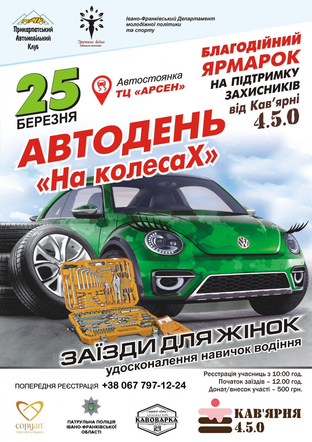 В Івано-Франківську 25 березня відбудеться благодійний захід “На колесаХ” - жінки з громадської організації “Дружина воїна” та Прикарпатського автоклубу влаштовують автодень і ярмарок, щоби придбати колеса та автомобільні інструменти для підрозділу ЗСУ.
