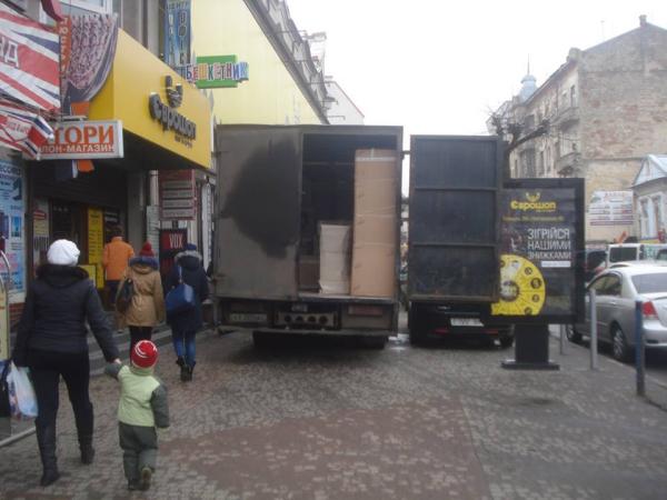 На світлинах видно, як біля торгового центру, прямо на тротуарі припаркувалася вантажівка, перекривши повністю пішохідну частину. Натомість у коментарях розгорнулася суперечка.
