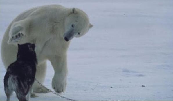 Канадець Давид де Мьюла опублікував зворушливе відео, на якому білий ведмідь гладить по голові ескімоську собаку, яка сидить на ланцюгу.