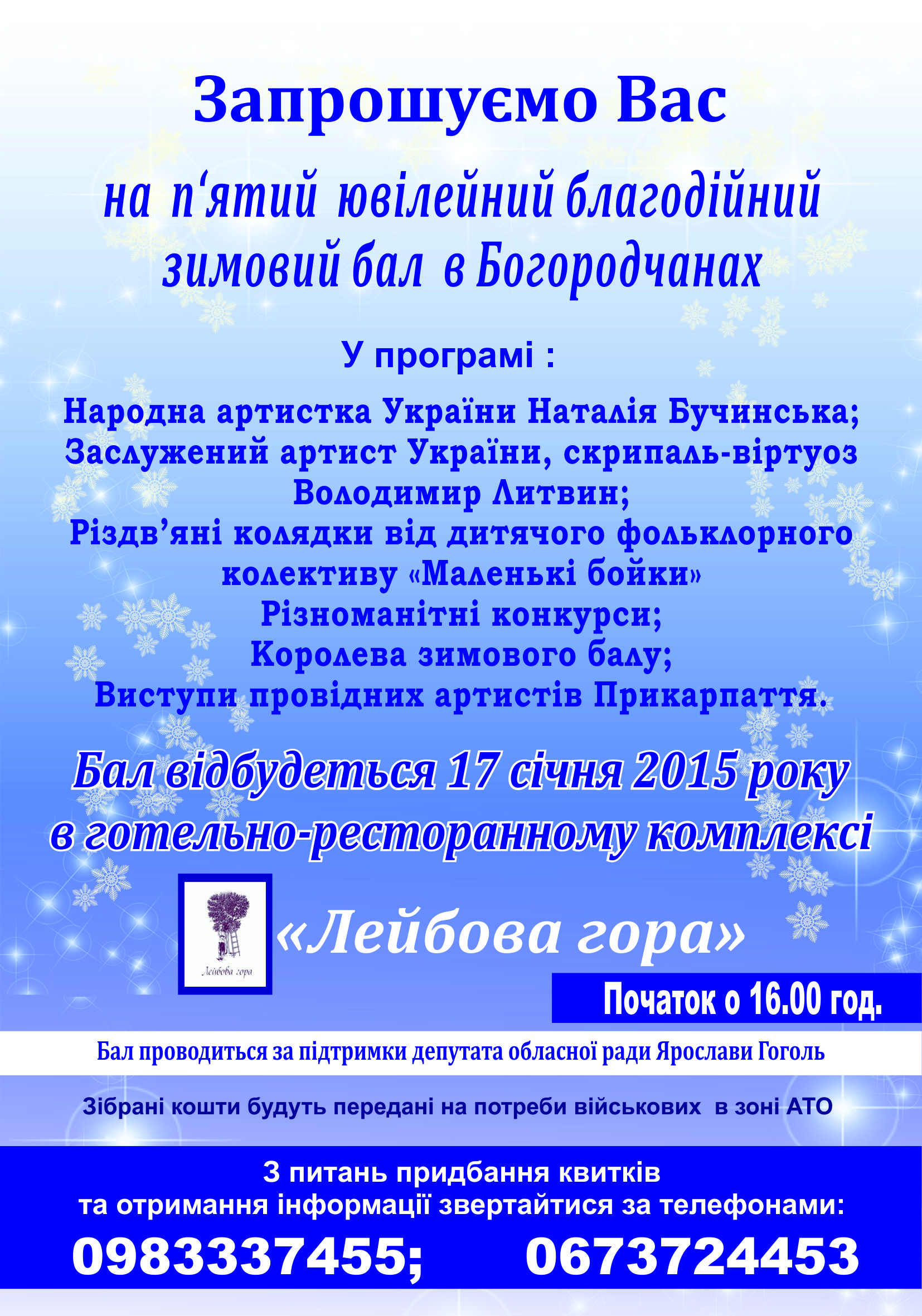 17 січня о 16 годині у Бородчанах розпочнеться вже п'ятий, ювілейний благодійний зимовий бал. Кошти, виручені на святковому заході будуть передані на потреби військових в зоні АТО.
