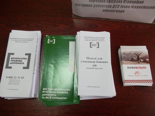 Представниками системи БВПД було надано методично-консультативну допомогу з питань пільг передбачених для учасників АТО, членів їх сімей та наголошено на можливості отримання правової допомоги з усіх питань, в Івано-Франківському місцевому центрі з надання безоплатної вторинної правової допомоги за адресою м. Івано-Франківськ вул. І. Франка 4.