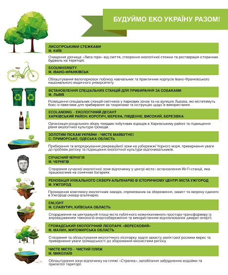 Більшість еко-ідей, які будуть реалізовані до кінця жовтня 2015 року, стосуються проблем енергозбереження, правильної утилізації та вторинної переробки відходів, очищення та облаштування водойм, а також популяризації еко-транспорту в Україні.