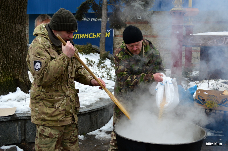 "Вода, каша пшенична, шкварки, м'ясо, цибуля, перець та сіль - каша готова. Пригощатимемо всіх охочих!" - каже Дутчак.