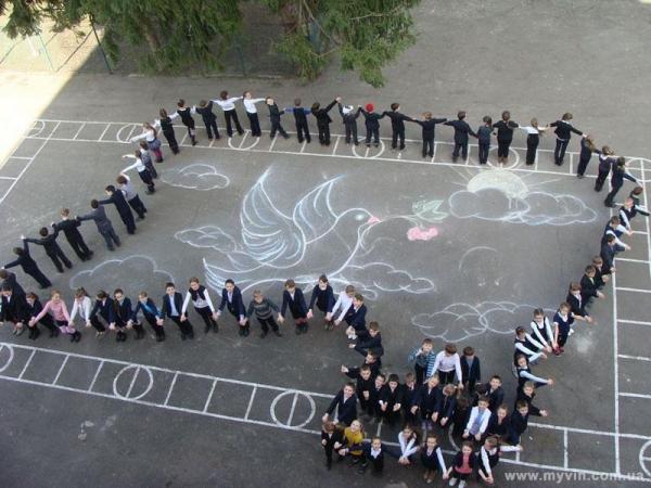Із гаслами «Україна – єдина» та «Ми за мир» учні старших класів утворили фігуру Державного Герба України – тризуб. Таким чином, франківські школярі висловили своє прагнення до єдності та миру в Україні.