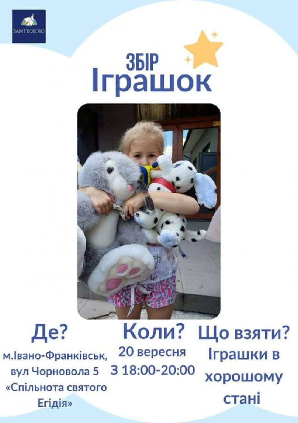 Приносити іграшки потрібно 20 вересня (вівторок) з 18:00 до 20:00 години. Адреса: Чорновола, 5, Спільнота Святого Егідія (Івано-Франківськ).