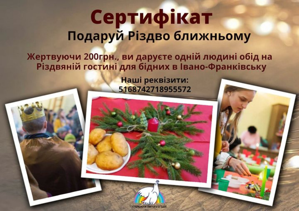 Всі охочі можуть купити благодійний сертифікат за 200 грн і подарувати одній людині обід на Різдвяній гостині для бідних.