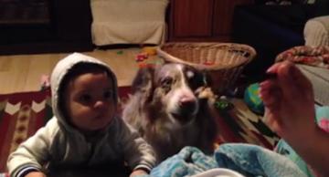 Поруч з ним сиділа голодна австралійська вівчарка, яка як заворожена стежила за виделкою господаря. Мабуть, бідному псу так хотілося їсти, що він заговорив людською мовою! І навіть виголосив то саме слово, яке батьки хотіли почути від їхнього малюка.