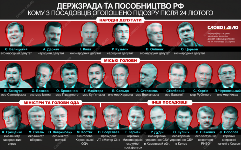 На інфографіці «Слово і діло» – хто із відомих посадових осіб після 24 лютого отримав підозру у державній зраді та пособництві.