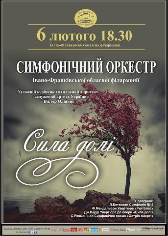 6 лютого. Концерт симфонічного оркестру «Сила долі». Диригент- з.а. України Віктор Олійник. У програмі концерту прозвучить Симфонія №5 Л. В. Бетховена, Увертюра «Рюї Блаз» Ф. Мендельсона, Увертюра до опери «Сила долі» Дж. Верді, Симфонічна поема «Острів мертвих» С. Рахманінова.