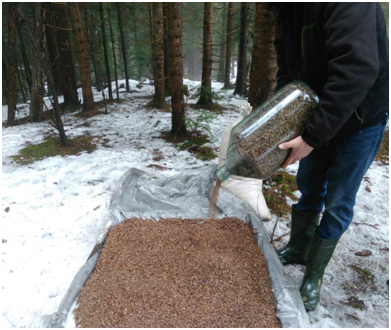 «Насіння висипаємо на вдвічі складену марлю (товщина 1,5-2 см), марлею й закриваємо насіння. Отримуємо такий собі плаский мішечок, – пояснює лісівниця. – Після цього «мішечок» засипають снігом. Зверху насипають деревну стружку, знову сніг, стружка, сніг…». У результаті над насінням утворюється замет заввишки метр. Таким чином насіння захищене від висипання та птахів.