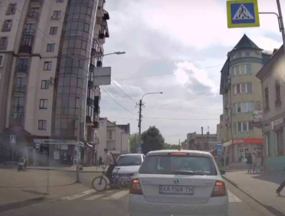 Як помітно, на пішохідному переході хлопець, не злізши з велосипеда, почав перетинати дорогу. Один з автомобілів пропустив велосипедиста, а водій "Мерседесу" не встиг зреагувати та зачепив двоколісного. Хлопець впав на тротуар, втім одразу піднявся. Очевидно, серйозних травм не отримав.