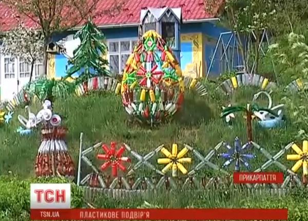 Власник приватної садиби у прикарпатському селі Гарасимів прикрашає власне обійстя пластиковими пляшками. Про це йдеться у сюжеті ТСН.
