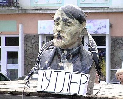 "Путлєр капут!" Коломияни на традиційному віче відкрили бюст Путіна з чорною стрічкою, перероблений із Гітлера. Мовляв, один одного варті. А ще, традиційно говорили про ситуацію на Сході і те, як можуть допомогти нашим хлопцям, що там перебувають.