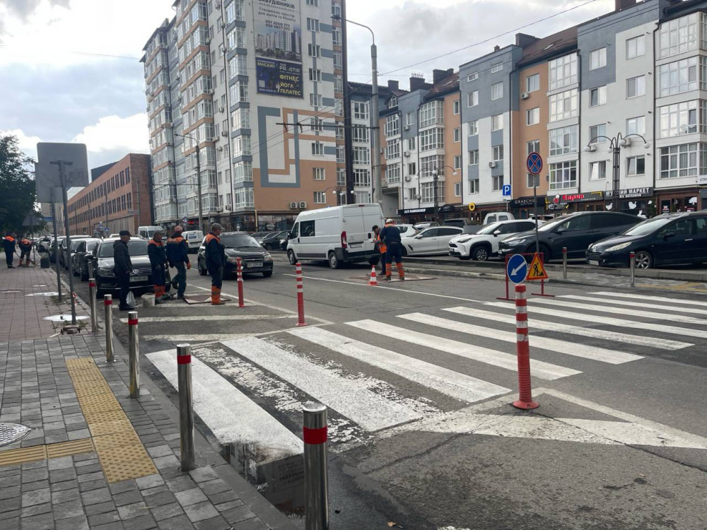 Так, встановлюють «Берлінські подушки». Ці елементи примусово знизять швидкість руху транспорту перед «зеброю». Також монтують підсвітку переходу. Наразі готові закладні. Незабаром тут з’являться опори та ліхтарі, які забезпечать кращу видимість у темний час.