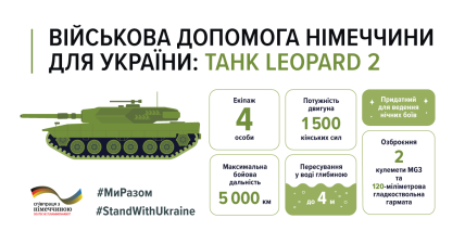 Що стосується танків Leopard 2, то Берлін готовий надати Україні 14 найсучасніших бойових танків типу А6. Як повідомили у німецькому посольстві, крім броньованих машин, пакет військової допомоги включає в себе ще й навчання українських військових силами Бундесверу, логістику, боєприпаси та технічне обслуговування танків.