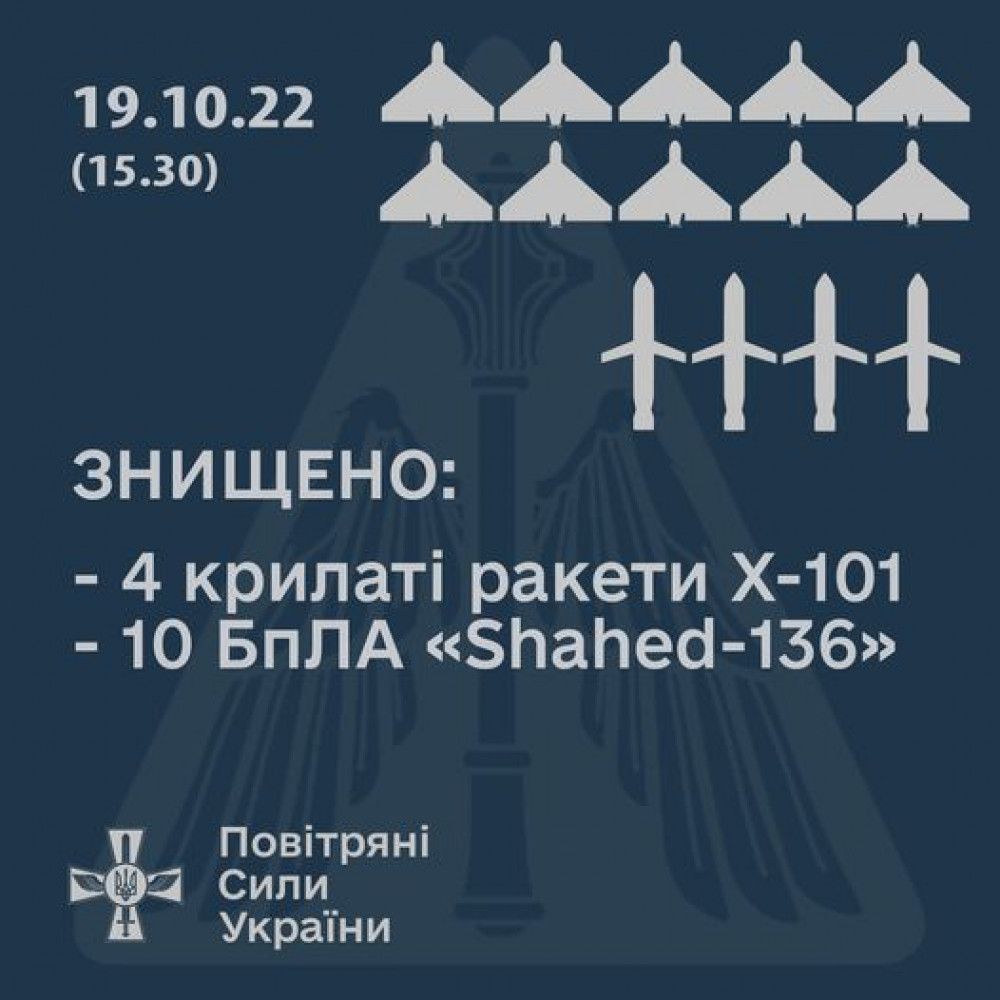 "Одну ракету знищено винищувальною авіацією, одну зенітним-ракетним підрозділом у зоні відповідальності Повітряне командування "Центр" на Київщині та Вінниччині. Ще дві ракети – збито протиповітряною обороною Сухопутних військ на Чернігівщині. Одночасно з ракетним обстрілом окупанти атакували Україну безпілотниками-камікадзе «Shahed-136» з північного напрямку, зокрема з території білорусі. Станом на 15.30 десять баражуючих боєприпасів було знищено протиповітряною обороною Повітряних Сил повітряного командування «Центр»",- кажуть у Командування Повітряних Сил ЗСУ.