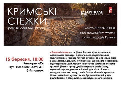 15 березня о 18:00 в книгарні "Є", що на Незалежності, 31 відбудеться показ фільму французького режисера Вінсента Муна «Кримські стежки».