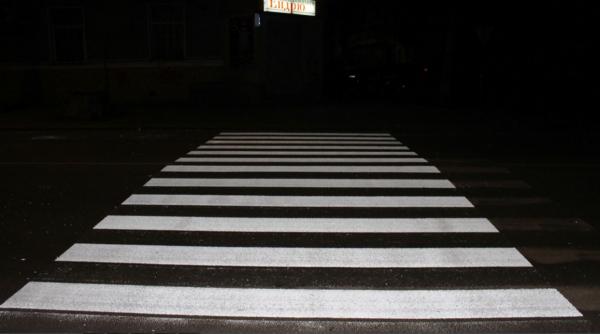 Після зняття скотчу і захисної плівки готовий перехід має такий вигляд: (дрібні цятки між смугами - це не розпилені каплі, а розкидані світловідбиваючі кульки, які розлетяться в сторони після проїзду кількох перших машин).
