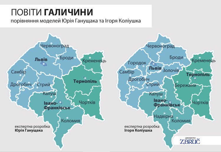У цьому матеріалі ретельніше зупинимося на моделях повітового устрою конкретного історичного реґіону, Галичини, розглянувши проекти двох українських фахівців з питань місцевого самоврядування та державного управління – керівника Центру політико-правових реформ Ігоря Коліушка та експерта «Реанімаційного пакету реформ» Юрія Ганущака.
