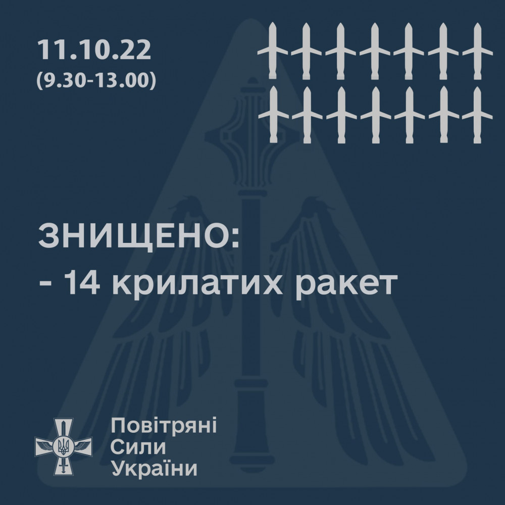 Підрозділи зенітних ракетних військ, авіація та мобільні вогневі групи Повітряне командування "Південь" Повітряне командування "Центр" Повітряне командування "Схід" Повітряне командування "Захід" Повітряних Сил ЗС України знищили 20 крилатих ракет та 13 БпЛА «Shahed-136».