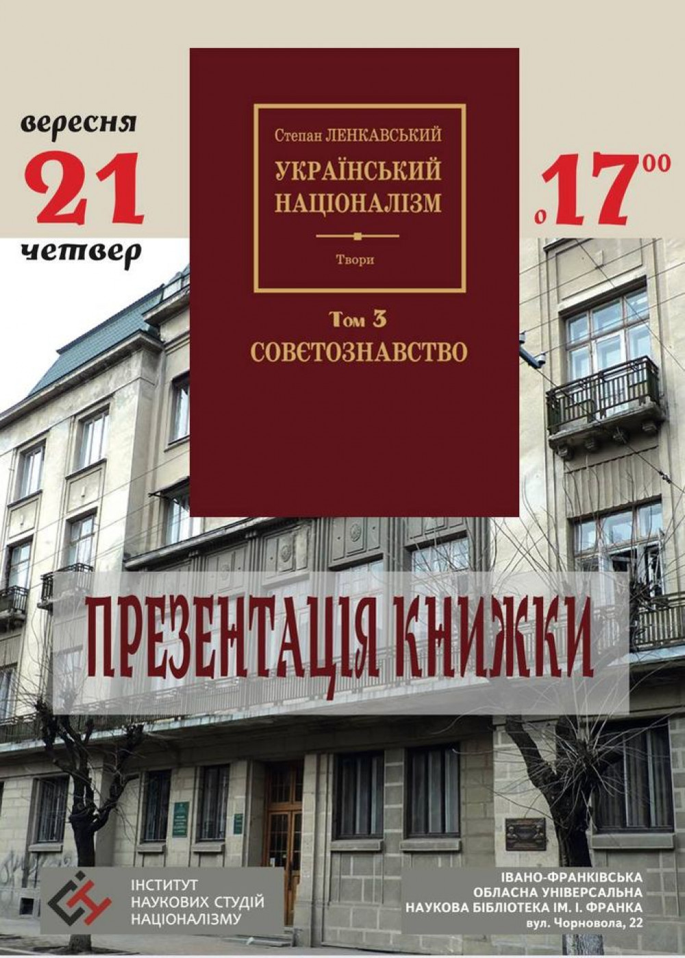 У четвер, 21 вересня, о 17-ій годині у приміщенні Івано-Франківської обласної універсальної наукової бібліотеки ім. Івана Франка (вул. Чорновола, 22) голова обласної ради, доктор політичних наук Олександр СИЧ презентуватиме збірку творів Степана Ленкавського "Український націоналізм. Том 3. Совєтознавство".