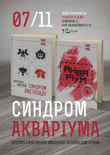 В суботу, 7 листопада, письменники Олексій Чупа та Вікторія Амеліна зустрінуться з читачами в Івано-Франківську. Автори презентують свої романи «Акваріум» та «Синдром листопаду, або Homo Compatiens», що вийшли у серії сучасної української інтелектуальної прози «Вітражі» харківського видавництва «Віват».