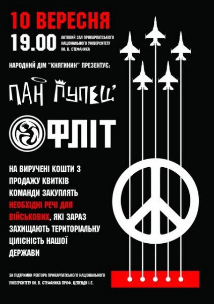 Сьогодні, 10 вересня, івано-франківські гурти "Фліт" і "Пан Пупец" у актовій залі Прикарпатського національного університету ім.В.Стефаника дадуть спільний благодійний концерт.