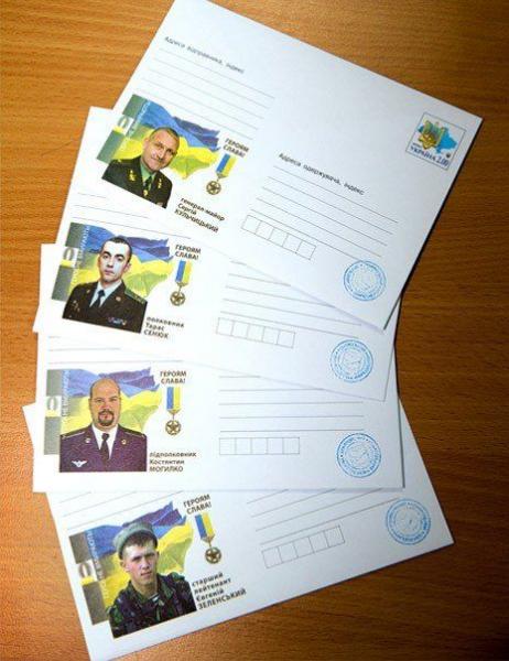 Як повідомляють у прес-службі міністерства інфраструктури на перших чотирьох конвертах зображені генерал-майор Сергій Кульчицький, полковник Тарас Сенюк, підполковникКостянтин Могилко і старший лейтенант Євгеній Зеленський.