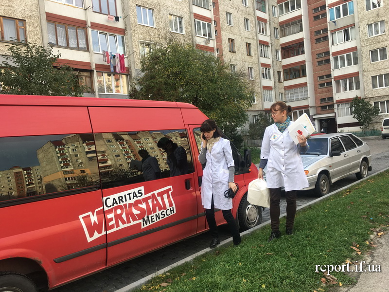 Перша адреса – двоповерховий будинок на Бельведерській. Під’їздить червоний мікроавтобус з написом «Карітас». Водій Олександр Малишкін припарковується, виходить відчинити важкі двері буса. Звідти з медичними сумками та журналами для записів виходять дві жінки у білих халатах з логотипом «Карітасу» – лікар Ольга Нащук та медсестра Оксана Василичук. Працюють тут після своєї основної роботи у поліклініках № 3 та № 1, пише Репортер