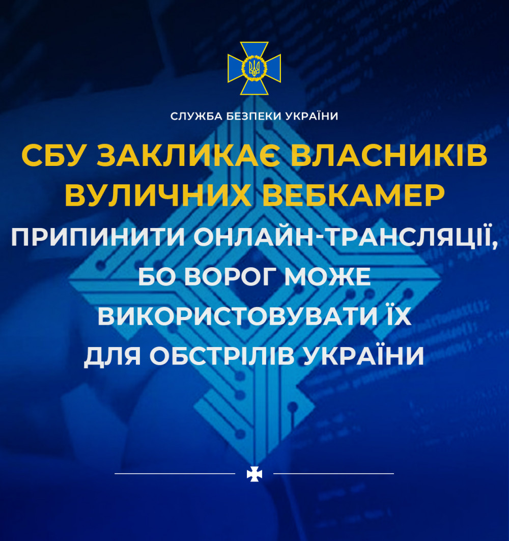Служба безпеки закликає власників вуличних вебкамер припинити онлайн-трансляції зі своїх пристроїв, а громадян – повідомляти про виявлені стріми з таких камер на офіційний чат-бот СБУ: t.me/stop_russian_war_bot.