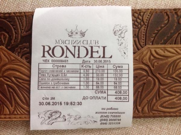 "Зараз ми сидимо в одному закладі в Івано-Франківську, який тупо виносить в одні ворота будь-який пафосний київський кабак ! Кажу це як людина, яку заможні клієнти час від часу водять в гламурні заклади wink emoticon. Ми втрьох наїлися до такого ступеню, що ніяк не можемо встати з диванів. Я нереально вражена - настільки, що просто не можу не пропіарити цю феноменальну харчєвню ! Будете у Франіку - обов'язково відвідайте! Просто скажіть таксисту - "В "Рондел", на 63-й завод", і вас за двадцять гривень та за 10 хвилин привезуть в цей рай для гурманів прямо з залізничного вокзалу ! Так, це колишня заводська їдальня 63-го котельно- зварювального заводу, але ЩО невідомі власники зробили з неї - це просто нереально потрясно ! НЯМ-НЯМ !!! ", написала у Фейсбук Тетяна Монтян, виклавши чек з ресторану.