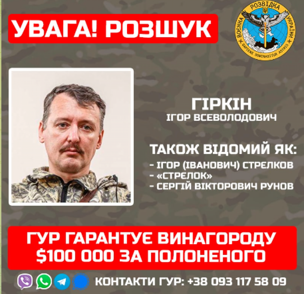 "Головне управління розвідки Міністерства оборони України гарантує виплату $100 000 за передачу Ігоря Гіркіна (Стрєлкова) в український полон. Відомо, що один з найвідоміших російських терористів вирішив поновити свою участь у війні проти нашої держави. Ігор Гіркін (Стрєлков) – російський терорист, колишній так званий «міністр оборони ДНР». Наразі СБУ та Генеральна прокуратура порушила проти Гіркіна низку справ за терористичну діяльність, тортури, вбивства та порушення державного суверенітету. Також оголошений Нідерландами в міжнародний розшук у справі про збиття цивільного Boeing 777 рейсу MH17. ГУР МО наголошує: жоден військовий злочинець не уникне покарання",- кажуть в ГУР.