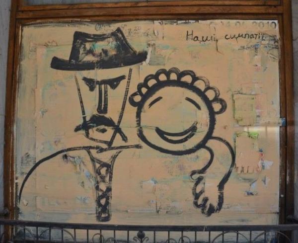 — Та минулого тижня домовилися, шо нині в восьмій ранку стрінемося в центрі і тупо намалюємо шось про гуцулів. Я хотів замінити корів на шось нове, — розповів “Вікнам” Петро Буяк. — А мені було самому скучно, та й матеріалу троха бракувало. Знаю, шо Стецик любит таківо тєми — він погодився. А зранку за пять секунд прийшла думка просто про Довбуша шось намалювати. Та й усе, — посміхається художник.