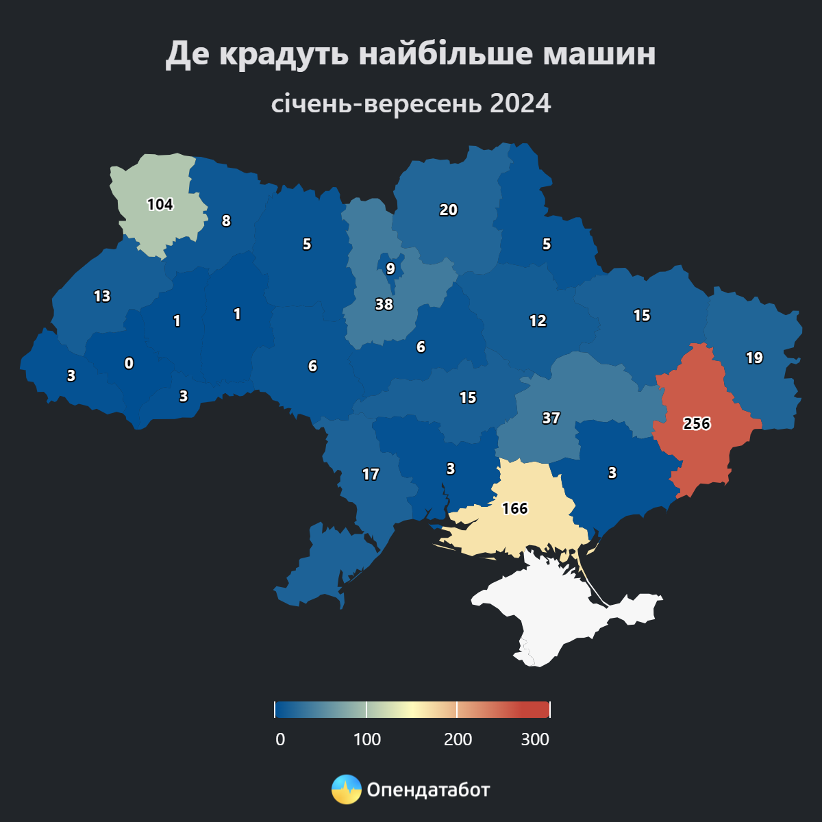 Найбільше автокрадіжок стабільно фіксується у Донецькій та Херсонській області — 256 та 166 випадків. Загалом це половина — 55% від загальної кількості викрадених авто у 2024 році.