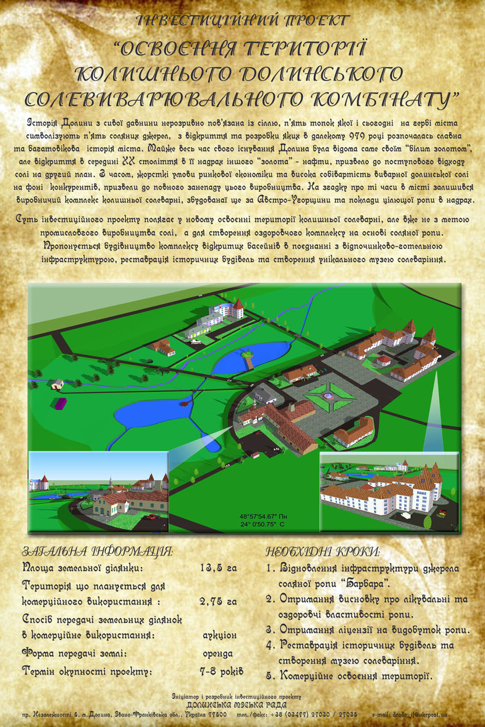 Так, було б добре відродити промислове (харчове) солеваріння, але це праця не одного дня. Окрім збору великої кількості документів, дозволів, висновків, патентів, потрібні й значні капіталовкладення. Тому доведеться починати із зовсім малого – розробки свердловини та видобування соляної ропи (розсолу) для застосування її в бальнеології та косметології.