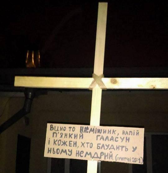 «вино то насмішник, напій п’янкий галасун і кожен, хто блудить у ньому немудрий (притчі 20:1)» — написано на хресті. Як повідомляють очевидці - одразу після встановлення хреста за ними гналися привокзальні пияки, билися в корчах і викрикали алкогольні викрики. Поки що ніхто не постаждав, але сподіваємося на краще",- написав Овчар.
