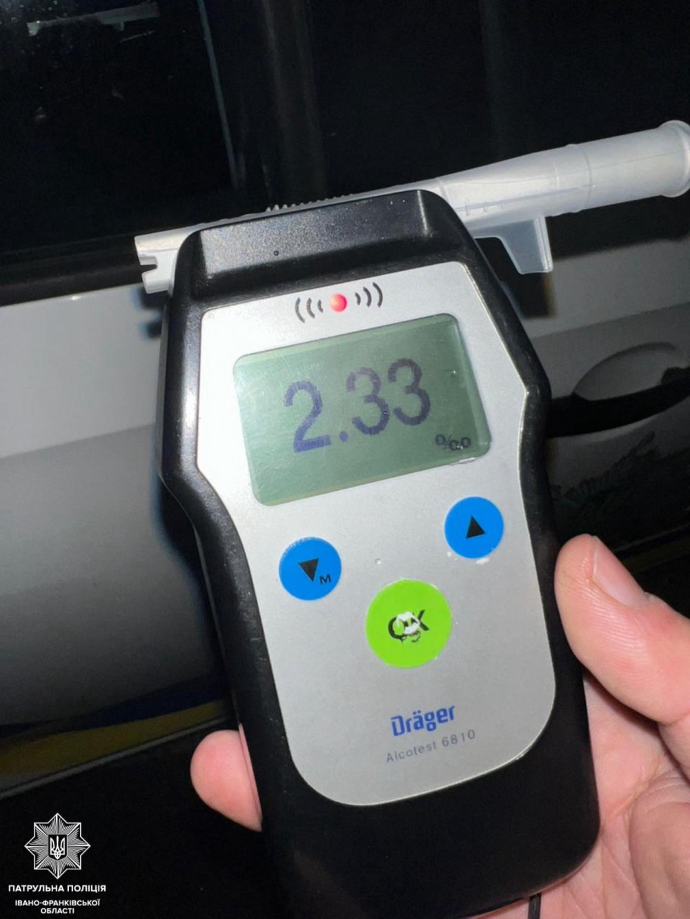 Під час спілкування з 33-річним водієм, поліцейські помітили в останнього ознаки сп'яніння. Чоловік пройшов освідування на місці. Результат — 2.33 проміле алкоголю. До того ж, чоловік позбавлений права керування транспортним засобом.