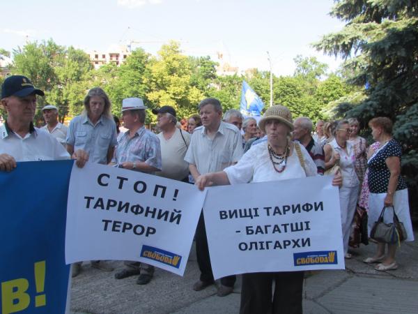 Сьогодні, 9 червня, біля Полтавської облдержадміністрації відбувся мітинг проти підняття тарифів. На нього прийшли близько сотні активістів. В руках тримали прапори ВО "Свобода" та плакати з надписами: "Стоп! Тарифний терор", "Ні! Тарифним градам", "Вищі тарифи — багатші олігархи".