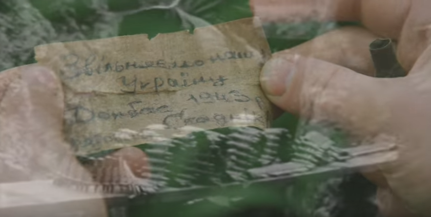 На відео український військовий на Донбасі знаходить в окопі патрон, у гільзі якого залишено коротку записку з текстом: “Звільняємо нашу Україну. Донбас. 1943 рік. Рядовий Стадник”.