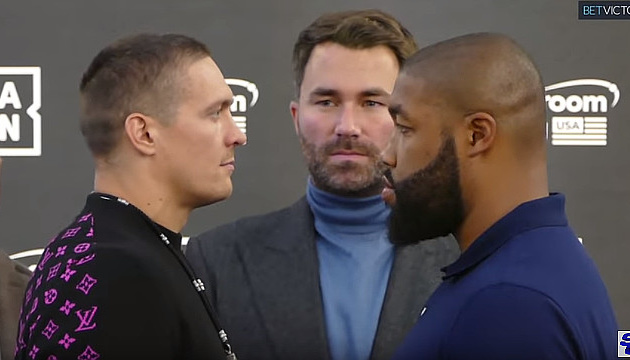 Український боксер Олександр Усик та його перший суперник у суперважкій вазі американець Чазз Візерспун провели традиційну дуель поглядів перед боєм.
