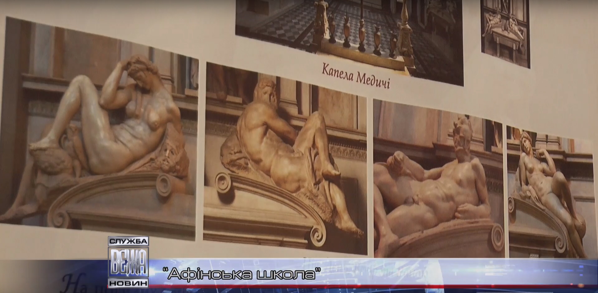 Мультимедійна екскурсія “Афінською школою” – завершальний етап культурного проекту “Ренесанс”. Протягом місяця відвідувачі знайомилися із архітектурою та художнім мистецтвом, створеними у часи розквіту європейського ренесансу. На виставці – макет Собору Святого Петра у Римі. А ще – одяг тих часів, відтворений із портретів. Також на показових стендах – алегоричні скульптури. У центрі – прикрашені фігурами саркофаги меценатів мистецтва – Джуліано та Лоренцо Медічі. Тут засинає “Вечір”, прокидається жіноча фігура “Ранок”, уважно пильнує атлет “День”. Завершує композицію зріла жінка, котра уособлює “Ніч”.
