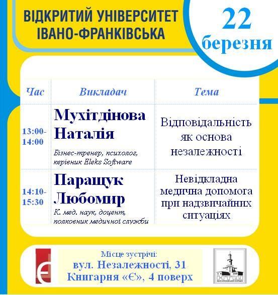 У суботу, 22 березня, в рамках проекту «Відкритий університет Івано-Франківська» відбудеться зустріч із психологом Наталею Мухітдіновою (лекція «Відповідальність як основа незалежності») та полковником медичної служби Любомиром Паращуком (Невідкладна медична допомога при надзвичайних ситуаціях).