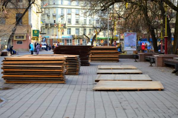 В середмісті Івано-Франківська монтують будиночки для Новорічного ярмарку