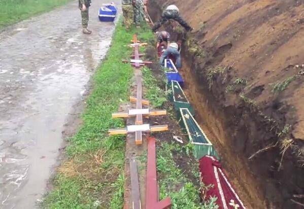 Вчора у Слов'янську терористи ховали своїх бойовиків. "Героїв", для яких в кінці стріляють залп, закопують просто під парканом, в ряд один за одним. Відео з YouTube.