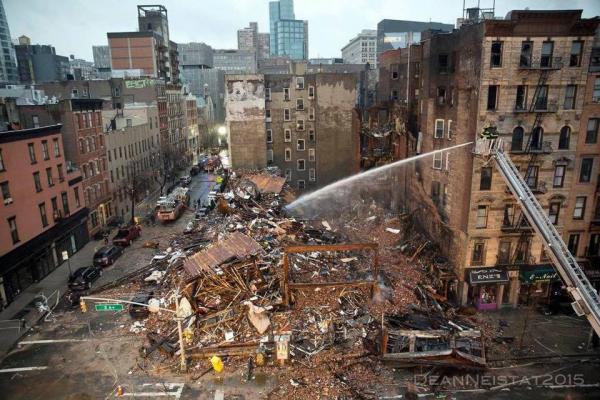 "Три будинки знищено вщент вибухом в Українському районі Мангетина що у Нью -Йорку, де мешкало багато Україців , а саме з Львівщини та Івано - Франківщини. Навпроти будинків щорічно проходив Український фестиваль . Там проживали і мої знайомі. Є потерпілі та важкопоранені. Зліва ми бачимо будівлю колишнього ресторану " Україна" та через 4 будівлі церкву св. Юри , українську школу при церкві", - йдеться в повідомленні.