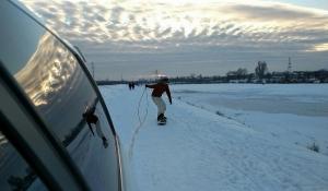 Відчайдухи проїхались околицями міста на сноубордах, причепившись мотузкою до позашляховика, пише Znaj.ua
